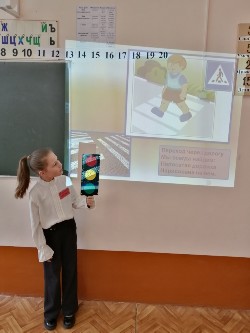 Мероприятие прошло в игровой форме. Вначале первоклассники посмотрели фильм. Усвоили, что дорога не место для игр, и переходить дорогу нужно только предназначенных местах. Узнали, для чего нужно знать правила дорожного движения? Приняли участие в викторине, поиграли в игру "светофор", отгадывали загадки о знаках. Затем вместе с детьми рассмотрели различные ситуации на дороге и обсудили, как правильно вести себя в каждой из них.